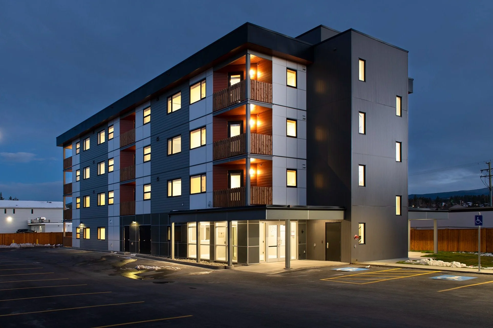 Designed for BC Housing, this 20 unit building contains supportive housing managed by the Canadian Mental Health Association. The much needed housing replaced two older duplexes that had reached the end of their service life. The four story building has balconies for every unit, while the neighbors are offered privacy through the use of timber slat guardrails. The building volume is broken up through the use of pattern, created by mixing cementitious panels, horizontal siding and vertical steel channel. The building is softened through the use of real wood railings and wood pattern steel cladding inside the balconies. While initially contentious in the neighborhood, the finished project has become a welcome addition to the community.